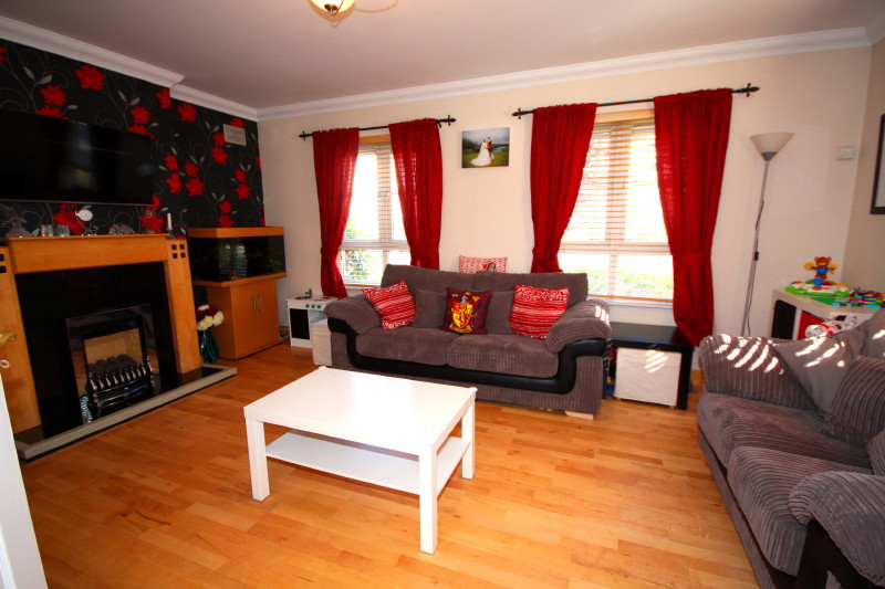 Bright stunning room with wooden floor and recess lighting. Feature fireplace with gas fire insert and marble surround.