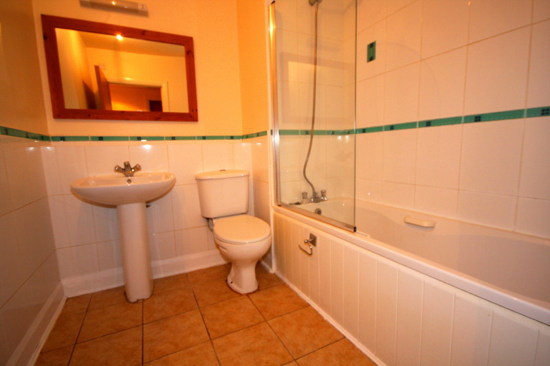 Family bathroom with tiled floor, bath with shower over, WC and w.h.b.