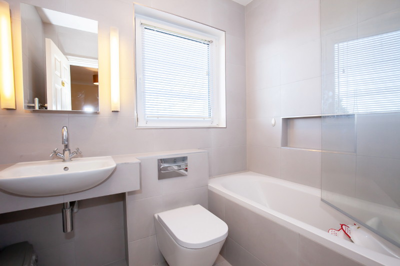 Newly fitted bathroom comprising bath with shower over, W.C., and w.h.b. Fully tiled floor and walls.