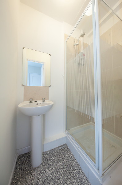 With lino floor, shower cubicle with electric shower and w.h.b.