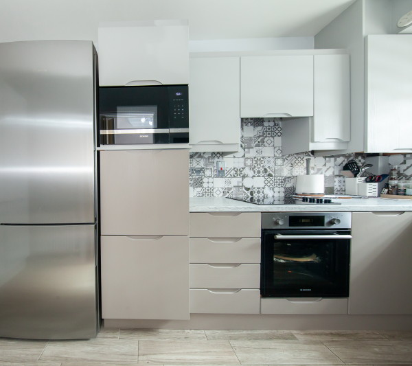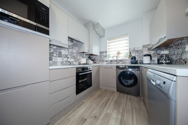Modern newly fitted Kitchen with tiled floor and extra wall and floor mounted units.