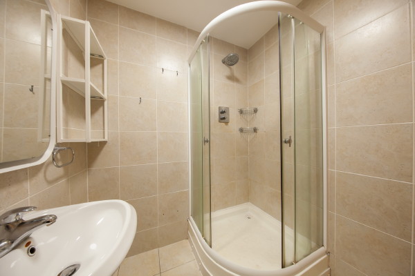 Family Bathroom fully tiled with bath and shower over.