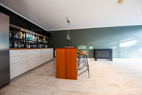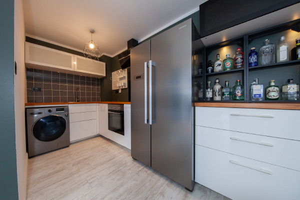Newly fitted kitchen with birch wood worktop and wooden floor.