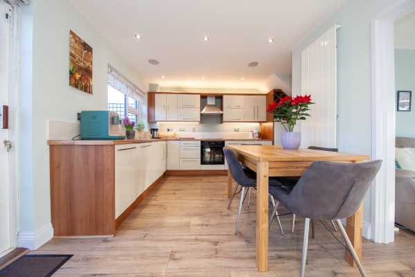 Large newly fitted open plan kitchen/ dining area with wooden floor.