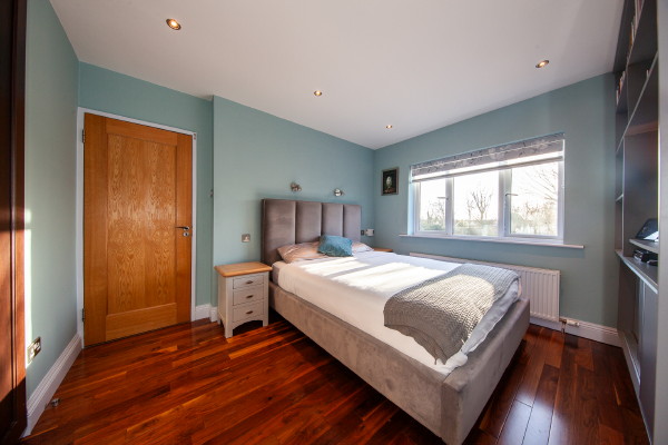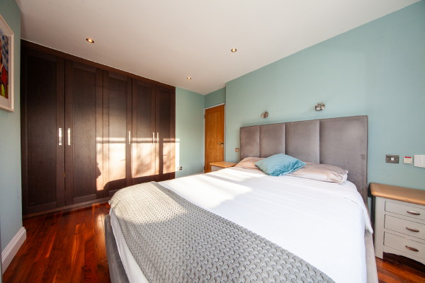 Large double bedroom with fitted wardrobes with walnut wooden floor.
