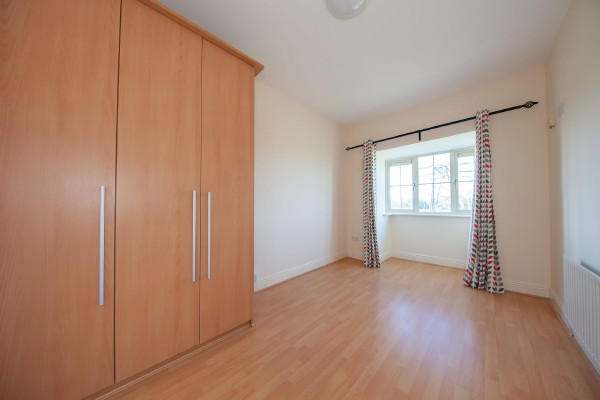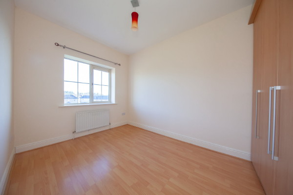 Double bedroom with fitted wardrobes and wooden floor.